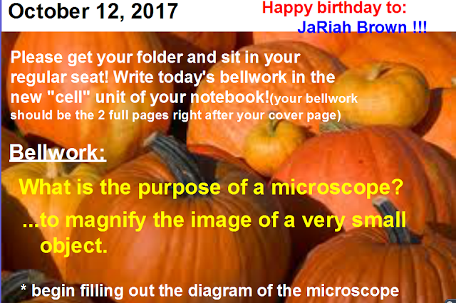 Today we completed a diagram of the parts of a microscope. Students who were absent need to pick up the worksheet tomorrow in class.